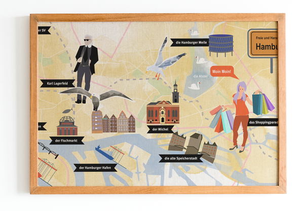 Na klar geeft op een inspirerende manier inzicht in de Duitse taal, land en cultuur. Ik illustreerde kaarten van steden en regio’s in Duitsland om de hoofdstukken te openen. Een geweldige opdracht voor educatieve uitgeverij Malmberg.
